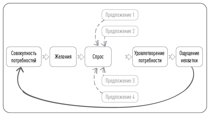 Спрос встречается с предложениями, которые должны дать что-то соответствующее желанию удовлетворить потребность. Количество предложений – это и есть насыщенность рынка компаниями. Компании конкурируют между собой, и выигрывает тот бизнес, чье предложение оказывается более подходящим под спрос клиентов по разным параметрам (сумма таких параметров называется ценностью). Далее происходит удовлетворение потребности, которое сменяется ощущением нехватки. Затем цикл начинается заново.