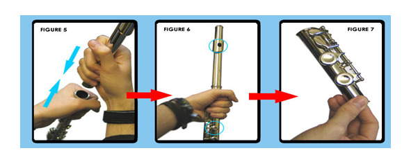 Крайне необходимо, чтобы механика и стыки частей флейты не подвергались механическому воздействию во время сборки и обслуживания флейты. Ремонт хрупких составляющих может быть довольно дорогостоящим. Поэтому не вынимайте флейту из кейса, держа ее за механику. Соблюдайте следующий порядок сборки флейты: