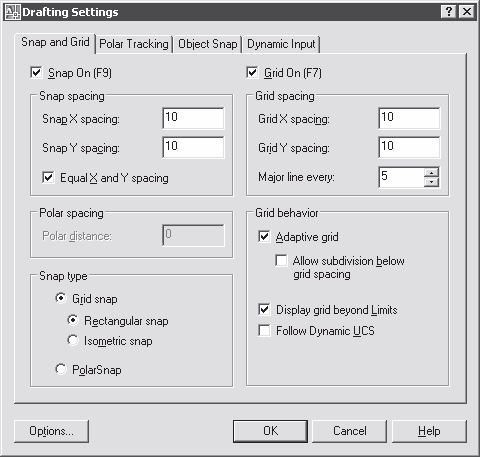 Включение сетки и определение ее частоты осуществляется на вкладке Snap and Grid диалогового окна режимов рисования Drafting Settings (рис. 1.10), которое загружается из падающего меню Tools → Drafting Settings… или при выборе пункта настройки Settings… контекстного меню, вызываемого щелчком правой кнопки мыши на кнопке GRID в строке состояния.