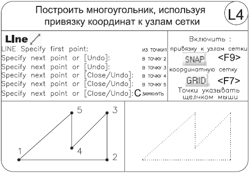 В режиме шаговой привязки SNAP курсор может находиться только в определенных точках согласно установленному значению шага и при этом движется не плавно, а скачкообразно между узлами воображаемой сетки, как бы «прилипая» к ним. Активность режима шаговой привязки SNAP можно определить визуально, по скачкообразному движению курсора на экране. Шаговая привязка обычно используется для точного указания точек с помощью мыши. Интервал привязки задается отдельно по осям XnY. Включение и отключение режима шаговой привязки может производиться в ходе выполнения команды.