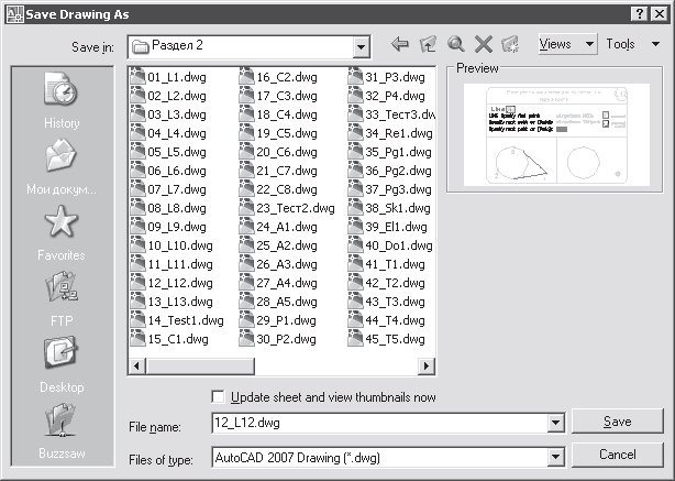 Предыдущей копии рисунка на диске присваивается расширение ВАК вместо DWG. Все предыдущие ВАК-файлы с данным именем удаляются. Обновленный рисунок записывается с расширением DWG. Если при указании имени файла оказывается, что рисунок с таким названием уже существует, выдается предупреждение и предоставляется возможность перезаписать файл или ввести другое имя.