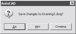 Команда позволяет сохранить или проигнорировать сделанные в рисунке изменения и выйти из AutoCAD. Если все выпоненные изменения сохранены, при выходе из программы не появится никаких дополнительных сообщений. В противном случае на экран будет выведено диалоговое окно AutoCAD (рис. 1.14), предлагающее пользователю выбор: сохранить изменения, отказаться от них или продолжить сеанс работы.