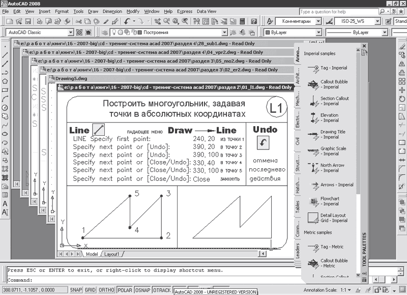 Tool Palettes Window CTRL+3 – инструментальные палитры в виде отдельных вкладок специального окна, которые служат эффективным средством хранения/вставки блоков и штриховки. Палитры могут содержать инструменты, предоставленные сторонними разработчиками;