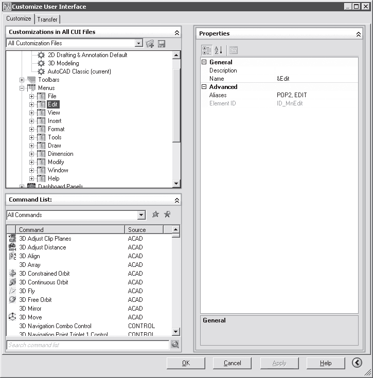 Строка падающих меню может быть изменена путем добавления либо удаления тех или иных пунктов. Для этого необходимо выбрать в падающем меню пункты Tools → Customize → Interface…, в появившемся диалоговом окне настройки интерфейса пользователя Customize User Interface на вкладке Customize, в области Customizatios in All CUI Files раскрыть пункт Menus (рис. 2.2). Далее установить указатель мыши на один из пунктов меню и, щелкнув правой кнопкой мыши, вызвать контекстное меню, в котором выбрать соответствующий пункт для удаления имеющихся или создания новых падающих меню.