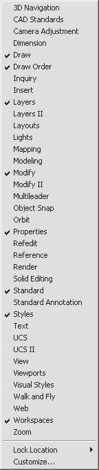 • Tools – управление рабочими пространствами; палитрами; установка порядка прорисовки объектов и получение сведений о них; работа с блоками и их атрибутами; работа с языком AutoLISP; работа с пользовательской системой координат; настройка стандартов оформления; управление Мастерами (публикации в Интернете, установки плоттеров, создания таблиц стилей печати, цветозависимых стилей печати, компоновки листа, создания подшивки, импорта параметров печати); установка параметров черчения и привязок с помощью диалоговых окон и пр.;