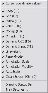 Отображение кнопок включения/выключения режимов черчения в строке состояния устанавливается в контекстном меню (рис. 2.11). Для этого необходимо щелкнуть левой или правой кнопкой на инструменте Status Bar menu с изображением стрелки вниз, который находится в правой части строки состояния.