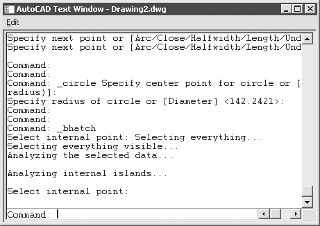Чтобы просмотреть большую часть протокола команд – так называемую историю команд (command history), можно переключиться в текстовое окно, показанное на рис. 2.15. Это окно вызывается нажатием функциональной клавиши F2 или командой TEXTSCR, а также с помощью меню View → Display → Text Window F2.