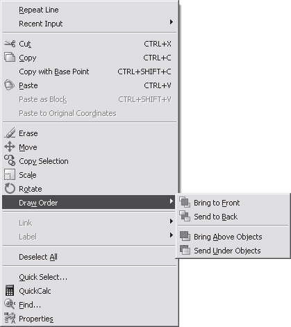Щелчок правой кнопкой мыши в области окна командных строк или текстового окна AutoCAD вызывает контекстное меню, куда входят шесть последних использованных команд, функции копирования выделенного текста или всего протокола команд, вставки текста, а также вызова диалогового окна настройки Options.