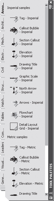 Инструментальные палитры представляют собой отдельные вкладки, объединенные в специальном окне TOOL PALETTES (рис. 2.17), и являются эффективным средством хранения и вставки блоков и штриховки, а также могут содержать инструменты, предоставленные сторонними разработчиками.