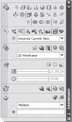 В рабочее пространство 3D Modeling включен новый пульт управления DASHBOARD, который по умолчанию закреплен с правой стороны области рисования. Он содержит кнопки и элементы управления, ориентированные на задачи установленного рабочего пространства (рис. 2.18).