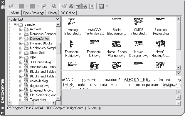 Центр управления AutoCAD загружается командой ADCENTER, либо из падающего меню Tools → Palettes → DesignCenter CTRL+2, либо щелчком на пиктограмме DesignCenter CTRL+2 на стандартной панели инструментов (рис. 2.19).