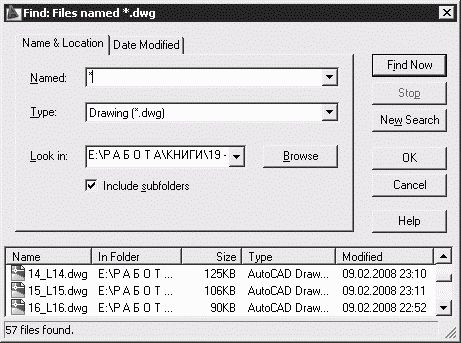 AutoCAD разрешает выполнять поиск файлов по датам их создания, пользуясь вкладкой Date Modified диалогового окна Find (рис. 1.4). Здесь организуется поиск файлов, созданных или измененных в период между двумя указанными датами либо за определенное количество последних дней или месяцев. Имена найденных документов отображаются в нижней части диалогового окна.
