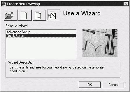 Use a Wizard – вызов Мастера для установки параметров нового чертежа. В области Select a Wizard: предлагается два режима автоматической настройки рабочей среды AutoCAD – детальная подготовка Advanced Setup и быстрая подготовка Quick Setup.