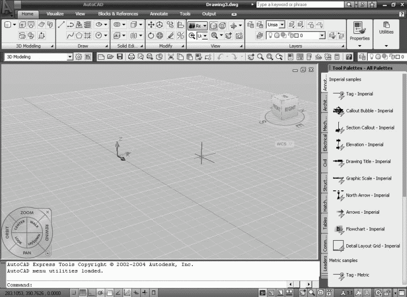 Рабочее пространство 3D Modeling включает новый пульт управления, обеспечивающий удобный доступ к новым функциям трехмерного моделирования. В области рисования отображается цвет фона, наземная плоскость или рабочая поверхность и новая прямоугольная сетка, что улучшает трехмерную визуализацию и облегчает создание пространственных моделей. Новый трехмерный курсор обеспечивает указание направления ПСК. Вкладки Model и Lauout заменены кнопками в строке состояния, благодаря чему расширена область рисования. На режим отображения вкладок можно переключиться, щелкнув правой кнопкой мыши на кнопке Model или Lauout.