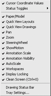 Отображение кнопок включения/выключения режимов черчения в строке состояния устанавливается в контекстном меню (рис. 2.14). Для этого необходимо щелкнуть левой или правой кнопкой на инструменте Application Status Bar Menu с изображением стрелки вниз, который находится в правом углу строки состояния.