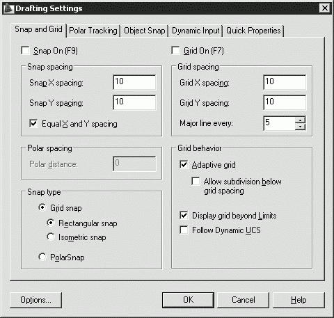 Включение сетки и определение ее частоты осуществляется на вкладке Snap and Grid диалогового окна режимов рисования Drafting Settings (рис. 1.10), которое загружается из падающего меню Tools → Drafting Settings… или при выборе пункта настройки Settings… контекстного меню, вызываемого щелчком правой кнопки мыши на кнопке Grid Display в строке состояния.