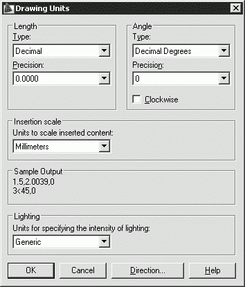 Размеры каждого из создаваемых в AutoCAD объектов задаются в условных единицах измерения. Соответствие единиц AutoCAD и единиц существующих метрических систем устанавливается перед рисованием. Так, в одном рисунке единица может соответствовать одному миллиметру, в другом – одному дюйму и т. д. Заданные значения определяют интерпретацию вводимых координат и углов, а также вид отображаемых координат и размеров.