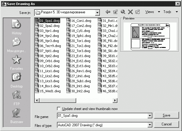 Предыдущей копии рисунка на диске присваивается расширение BAK вместо DWG. Все предыдущие BAK-файлы с данным именем удаляются. Обновленный рисунок записывается с расширением DWG. Если при указании имени файла оказывается, что рисунок с таким названием уже существует, выдается предупреждение и предоставляется возможность перезаписать файл или ввести другое имя.