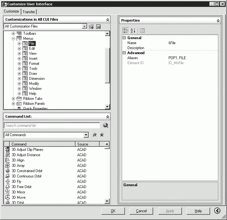 Строка падающих меню может быть изменена путем добавления либо удаления тех или иных пунктов. Для этого необходимо выбрать в падающем меню пункты Tools → Customize → Interface…, в появившемся диалоговом окне настройки интерфейса пользователя Customize User Interface на вкладке Customize, в области Customizatios in All CUI Files раскрыть пункт Menus (рис. 2.3). Далее установить указатель мыши на один из пунктов меню и, нажав правую кнопку мыши, вызвать контекстное меню, в котором выбрать соответствующий пункт для удаления имеющихся или создания новых падающих меню.