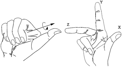 Для определения положительных направлений осей необходимо поднести тыльную сторону кисти правой руки к экрану монитора и направить большой палец параллельно оси X, а указательный – по оси Y. Если согнуть средний палец перпендикулярно ладони, как показано на рис. 4.6 справа, то он будет указывать положительное направление оси Z.