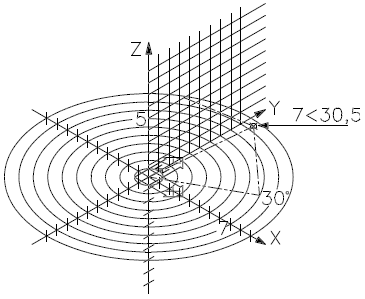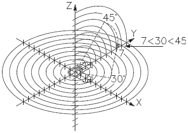На рис. 4.8 показана точка с координатами 7<30<45. Эта точка лежит на расстоянии 7 единиц от начала текущей ПСК, под углом 30° к оси X в плоскости XY и под углом 45° к плоскости XY.