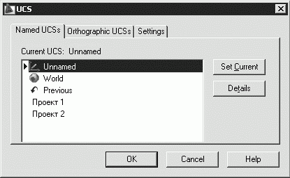 Управление системами координат осуществляется с помощью команды DDUCS, вызываемой из падающего меню Tools → Named UCS… или щелчком на пиктограмме Named UCS… на панели инструментов UCSII. На вкладке Named UCSs диалогового окна UCS можно присвоить любой пользовательской системе координат уникальное имя.