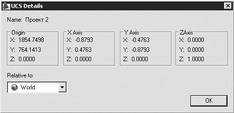 При щелчке на кнопке Details раскрывается подробное диалоговое окно UCS Details, в котором отражена вся информация о координатах точки начала и направлении осей относительно текущей системы координат по каждой именованной ПСК (рис. 4.13).