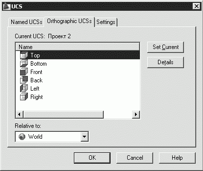 С помощью данной команды можно определить новую пользовательскую систему координат по отношению либо к мировой, либо к текущей, выбрав соответствующий слайд в диалоговом окне. Команду DDUCSP используют в основном для переноса пользовательской системы координат из одной ортогональной проекции в другую.