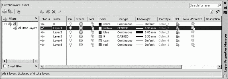 Управление установками свойств слоев осуществляется в Диспетчере свойств слоев Layer Properties Manager, показанном на рис. 5.1. Оно загружается из падающего меню Format → Layer… или щелчком на пиктограмме Layer Properties Manager на панели инструментов Layers.