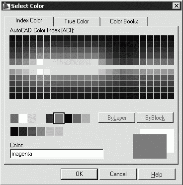 Присвоение цветов слоям осуществляется в Диспетчере свойств слоев Layer Properties Manager, показанном на рис. 5.1. Для этого необходимо щелкнуть на пиктограмме Color соответствующего слоя. При этом загружается диалоговое окно Select Color, предлагающее выбрать оттенок на палитре – рис. 5.3.