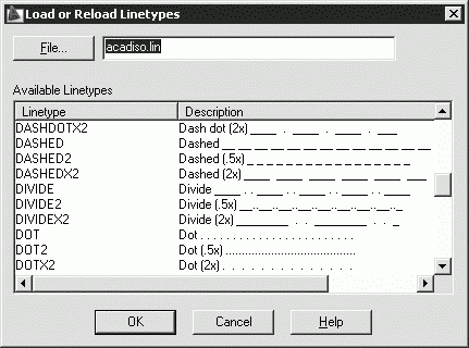 Назначение типа линии слою осуществляется в Диспетчере свойств слоев Layer Properties Manager. Для этого необходимо щелкнуть на пиктограмме Linetype соответствующего слоя. В открывшемся диалоговом окне Select Linetype, показанном на рис. 5.5, выбирается подходящий тип линии. Если в предлагаемом списке нет нужного варианта, следует подгрузить его, щелкнув на кнопке Load… и указав в открывшемся диалоговом окне Load or Reload Linetypes подходящий образец линии (рис. 5.6), затем, вернувшись в диалоговое окно Select Linetype, установить указатель мыши на требуемый тип линии.