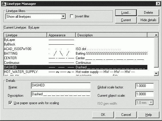 Для задания масштаба типов линий необходимо загрузить Диспетчер типов линий Linetype Manager из падающего меню Format → Linetype… и щелкнуть на кнопке Show details для включения подробного окна (рис. 5.7).