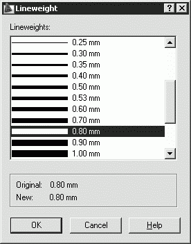 Вес линии устанавливается в Диспетчере свойств слоев Layer Properties Manager (см. рис. 5.1). Для этого необходимо щелкнуть на пиктограмме Lineweight соответствующего слоя, а затем в открывшемся диалоговом окне Lineweight выбрать из списка подходящее значение (рис. 5.8).