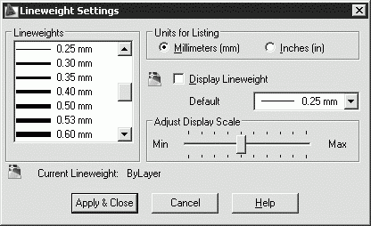 Веса линий можно выбирать из определенного ряда значений, среди которых есть специальный вес под названием Default. По умолчанию вес линии Default соответствует толщине 0,25 мм (0,01 дюйма), это значение устанавливается системной переменной LWDEFAULT.