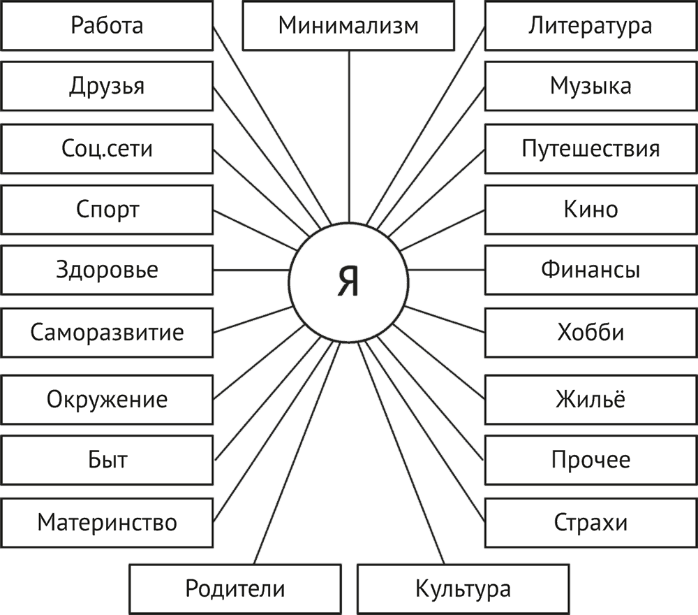 Теперь напротив сфер вашей жизни, которые еще не реализованы или реализованы недостаточно, поставьте звездочки, как в примере на рис. 2. Это то, на чем вы сосредоточите усилия в ближайшее время. Некоторые из пунктов отпадут сами собой в процессе чтения книги. И это хорошо, потому что распыление сил по многим направлениям не даст той эффективности, которой можно добиться, сконцентрировавшись на 3 – 4 целях.