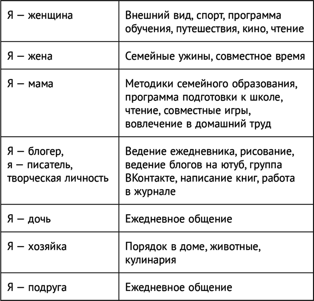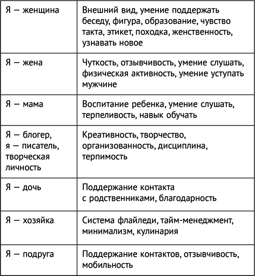 И да, приоритеты ролей могут меняться время от времени. К примеру, если вы ждете малыша, то сразу после рождения «я-мама» переместится на первое место, и это правильно, зато после выхода из декрета «Я – бизнесвумен», возможно, вырвется в лидеры. Потом, когда энтузиазм поутихнет, на первое место снова может встать роль «Я – женщина» или «Я – жена».