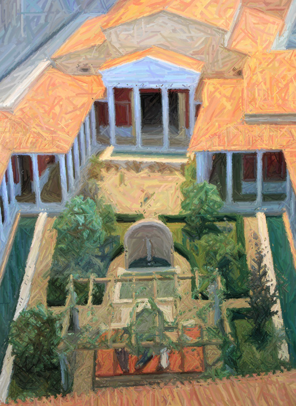 Осторожно приоткрыв дверь и убедившись в том, что ее никто не видит, Целия, крадучись, вошла в просторный тосканский атрий. Она и представить себе не могла всю грандиозность и одновременно благородную простоту этого помещения, поразившего ее строгой утонченностью архитектурных форм: стены покрыты блестящей штукатуркой и разрисованы квадратными узорами, имитирующими мраморные плиты зеленых, желтых и синих цветов, высокий потолок с комплювием25, а в середине двора – знакомый бассейн с выложенной по дну розово-голубой плиткой и танцующим задорным Фавном.
