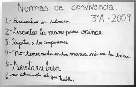 Pero, ¿cómo se hace este traspaso de responsabilidad en forma sana y eficiente? Una de las maneras en que se puede lograr este objetivo es a través del establecimiento de normas (contrato) que regulen el trabajo del grupo entre sí y con el profesor/a. Sin embargo, estas reglas deben surgir del mismo grupo de niños/as y no ser impuestas por el profesor/a. Cuando las reglas se crean en respuesta a los problemas que los mismos niños/as identifican, es más probable que las sientan como propias. Al sentir que las reglas les pertenecen, es más factible que no sólo las respeten, sino que también ayuden a que todos sus compañeros y compañeras también lo hagan.