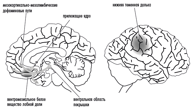Рис. 2. На этом рисунке выделены две области, повреждение которых приводит к утрате сновидений: вентромезиальное белое вещество лобной доли (слева) и нижняя теменная долька коры (справа). Отмечены также вентральная область покрышки мозгового ствола и отходящие от нее основные волокнистые пучки, а именно мезокортикально-мезолимбические дофаминовые пути. Обратите внимание: место повреждения вентромезиальной лобной доли охватывает эти подкорковые пути, которые проходят под корой, а не внутри нее. Ведут эти пути главным образом в прилежащее ядро (оно также отмечено)
