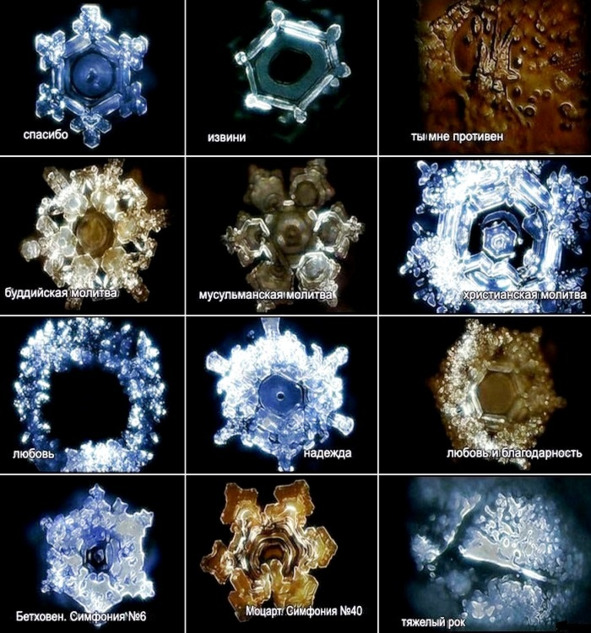Рис. 25. Фото кристаллов воды, на которую воздействовали словами, музыкой или изображением, а потом моментально замораживали и изучали под микроскопом.