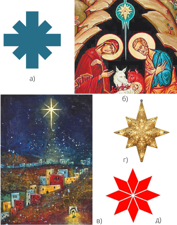 Посмотрите внимательно на рисунок 26, где восьмиконечная звезда представлена в разных версиях: а) возможная форма проруби во времена язычества; б) вифлиемовская звезда на иконах; в) вифлиемовская звезда на картинах; г) современная ёлочная игрушка; д) один из сильнейших славянских обереговых символов – Алатырь.