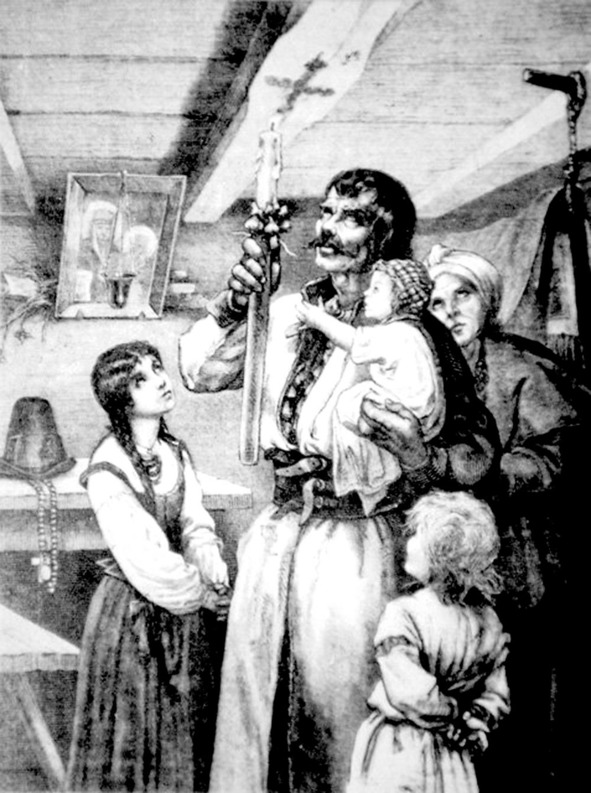 Стары старухи и пожилые бабы домовничали; с молитвой клали они мелом кресты над дверьми и над окнами ради отогнания нечистого… Мужики вкруг лошадей возились: известно, кто в крещенский сочельник у коня копыта почистит, у того конь весь год не будет хромать и не случится с ним иной болести. Но, веря своей примете, мужики не доверяли бабьим обрядам и, ворча себе под нос, копались средь дворов в навозе, глядя, не осталось ли там огня после того, как с вечера старухи пуки лучины тут жгли, чтоб на том свете родителям было теплее. В избах у красного угла толпились ребятишки. Притаив дыханье, глаз не спускали они с чашки, наполненной водою и поставленной у божницы: как наступит Христово крещенье, сама собой вода колыхнется и небо растворится; глянь в раскрытое на един миг небо и помолись Богу: чего у него ни попросишь, всё даст.»