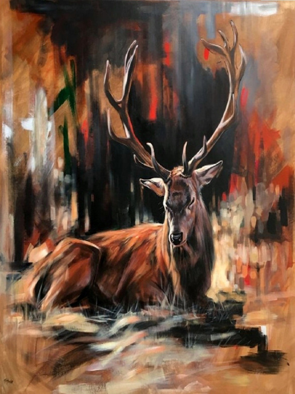 Со стороны реки надвигался шум вперемешку с шумом копыт, лаем собак и звуками охотничьего горна. Он увидел, как огромный самец быстро приближается к его колонне. Через минуту олень был уже так близко, что смог увидеть свою убитую самку и ее олененка.