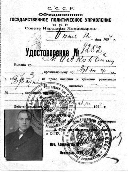 Маяковскому в 1919 году Петербургским комитетом Российской коммунистической партии карманного пистолета «Велодок» (свидетельство № 12, номер пистолета в нём не указан), произведённого Тульским оружейным заводом, бельгийского пистолета системы Браунинга № 268979 (9-мм модель 1900, разрешение № 8252/к, номер пистолета в разрешении также отсутствовал) от 1924 года и российского пистолета системы «Байярд 1908» № 268579 под патрон 6,35 мм (разрешение № 4178/22076), выданного в 1929 году. Все образцы из этого арсенала, за исключением армейского «Браунинга», являлись оружием самообороны, популярным среди обывателей, которые использовали его в основном для того, чтобы отбиваться от расплодившихся сверх всякой меры уличных хулиганов и грабителей. Наличие у Маяковского дефицитного «Маузера», по всей видимости, объяснялось его близкой дружбой с начальником секретно-политического отдела ГПУ Украинской ССР Валерием Михайловичем Горожаниным. Скорее всего, этот пистолет был подарен поэту харьковскими чекистами[5], а разрешение на его хранение и ношение подписал сам Валерий Михайлович, хотя и не имел на это должностных полномочий.