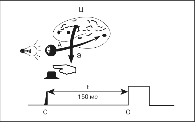Рис. 3. Схема измерения времени двигательной реакции: А – афферентные, Э – эфферентные и Ц – центральные пути; С – отметка светового сигнала; О – отметка нажима кнопки; t 150 мс – время реакции