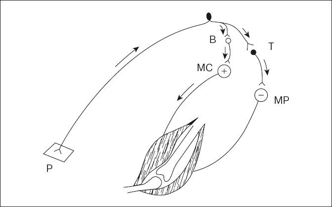 Рис. 4. Участие тормозной клетки в регуляции мышц-антагонистов: В и Т – возбуждающий и тормозной нейроны; возбуждение (+) мотонейрона мышцы-сгибателя (МС) и торможение (-) мотонейрона мышцы-разгибателя (MP); Р – кожный рецептор