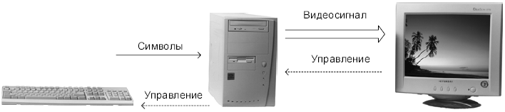 На рис. 1.2 стрелками показано движение информации между блоками компьютера. От клавиатуры идет редкий поток символов, которые человек посылает компьютеру, нажимая на клавиши. Скорость набора текста или нажатия клавиш редко превышает 200 символов в минуту, поэтому такой информационный поток мы обозначили тонкой сплошной стрелкой. Компьютер изредка посылает клавиатуре команды управления (на рис. 1.2 они показаны пунктиром).