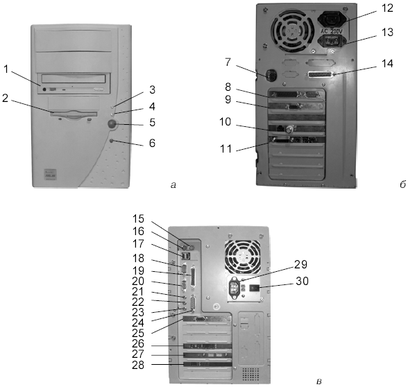 Рис. 1.3. Системный блок: а – лицевая панель: 1 – привод компакт-дисков; 2 – дисковод гибких дисков; 3 – индикатор «Сеть»; 4 – индикатор «Винчестер»; 5 – кнопка включения питания; 6 – кнопка RESET; б – задняя панель форм-фактора AT: 7 – разъем для подключения клавиатуры; 8 – COM-порты для подключения модема или мыши; 9 – разъем для подключения монитора; 10 – сетевая карта; 11 – звуковая карта; 12 – розетка для подключения монитора; 13 – сетевая розетка; 14 – параллельный порт для принтера; в – задняя панель форм-фактора ATX: 15 – разъем для подключения мыши с интерфейсом PS/2; 16 – разъем для подключения клавиатуры с интерфейсом PS/2; 17 – разъемы для подключения USB-устройств; 18, 20 – последовательные COM-порты для подключения модема или мыши; 19 – параллельный порт для принтера; 21 – разъем для подключения микрофона; 22 – линейный звуковой выход; 23 – разъем для подключения акустической системы; 24 – разъем для подключения джойстика; 25 – разъем для подключения монитора; 26 – карта внутреннего модема; 27 – дополнительные разъемы для подключения USB-устройств; 28 – сетевая карта; 29 – сетевой разъем; 30 – сетевой выключатель