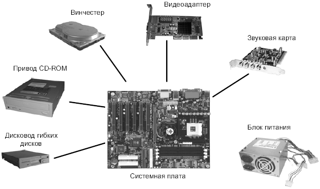 В центре рисунка изображена системная плата, часто ее называют материнской платой или, в обиходе, «мамой». На системной плате размещаются все элементы компьютера, без которых он не может работать: процессор, микросхемы памяти и так называемый чипсет — набор микросхем, организующих работу периферийных устройств.