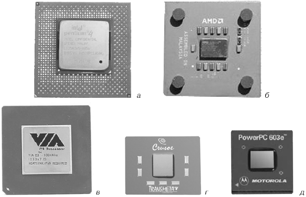 Рис. 1.16. Процессоры: а – Intel Pentium 4; б – AMD К7 Athlon; в – VIA I3; г – Crusoe; д – Motorola PowerPC 603